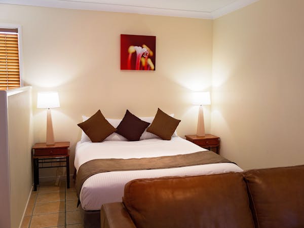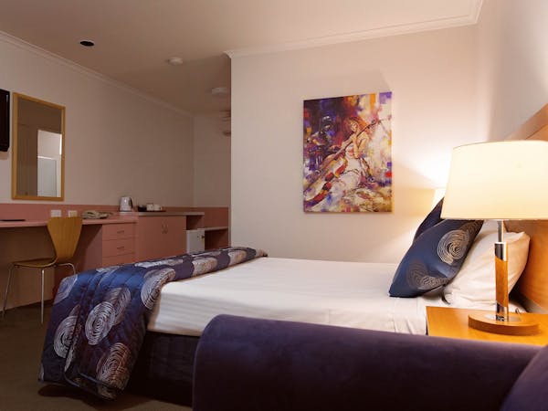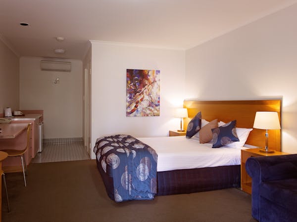 Good sized room located in the main accommodation wing – Upstairs or Downstairs options available. Each comfortable air conditioned room has a queen bed, dining table, small lounge and is perfect for the overnight traveler/corporate guest Room Size 26 m²