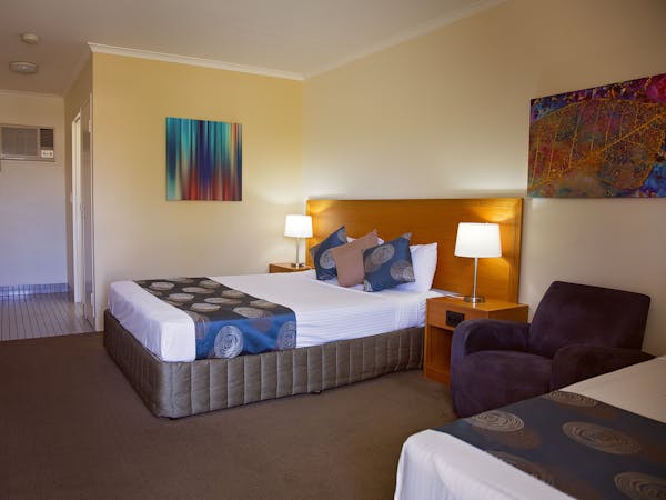 Good sized room located in the main accommodation wing – Upstairs or Downstairs options available. Each comfortable air conditioned room has a queen bed & a Single Bed, dining table, small lounge and is perfect for the overnight traveler/corporate guest Room Size 26 m²